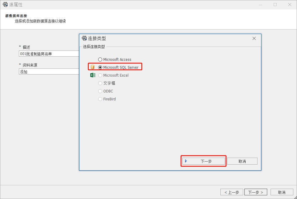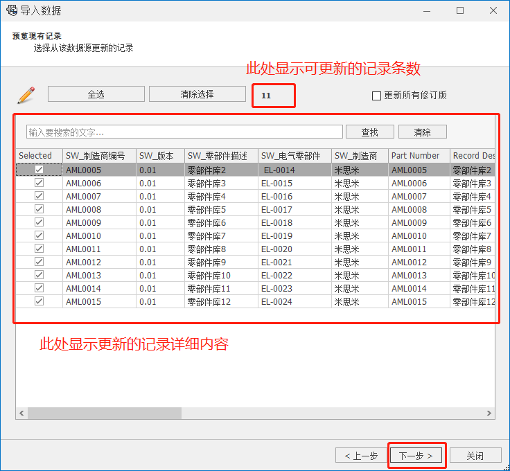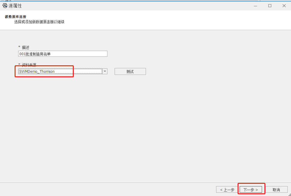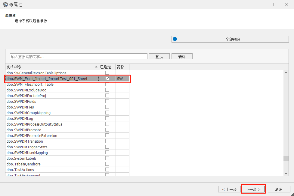 上图点击下一步后,显示并勾选需要导入的数据源表格,此处即为之前所记录的SQL表名称。