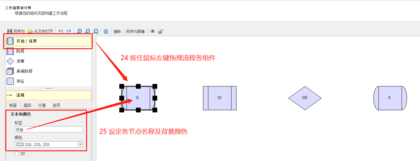14)完成“工作流程设计师”配置后,下一步进入“工作流程属性”配置界面,该界面用于对上一步中搭建的流程中的各个节点设置属性。