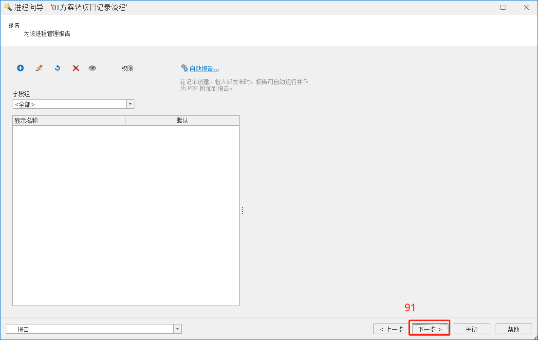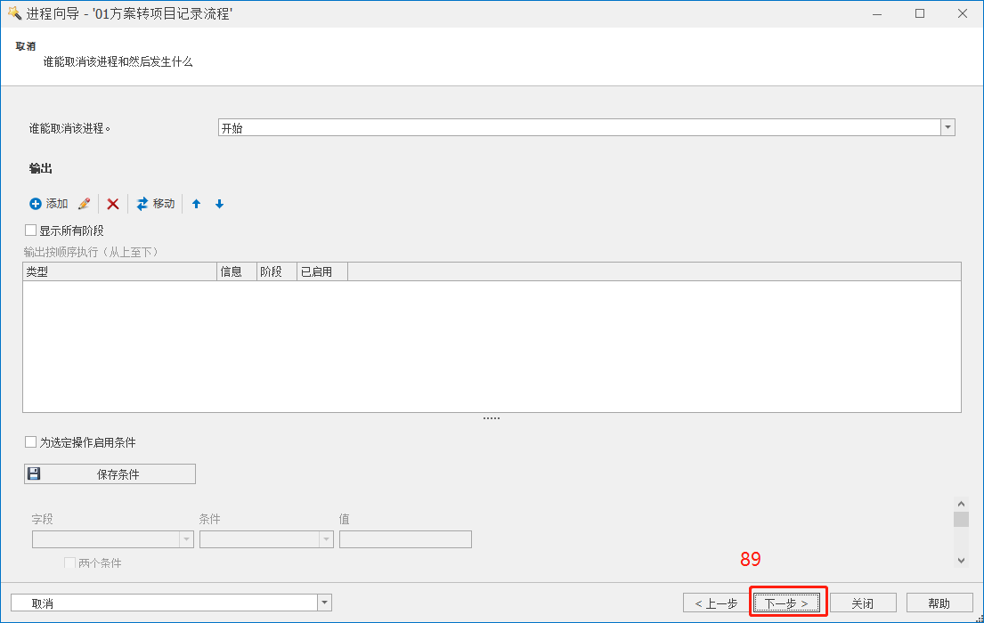 8)完成流程“访问权限”配置后,下一步进入“在进程启动时输出”配置界面,因启动流程时无需输出,在此配置页面可直接点击下一步。