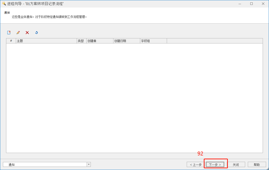 2)点击上图中的3后,弹出“进程向导”界面,直接点击“下一步”,进入进程“主要配置”页面。